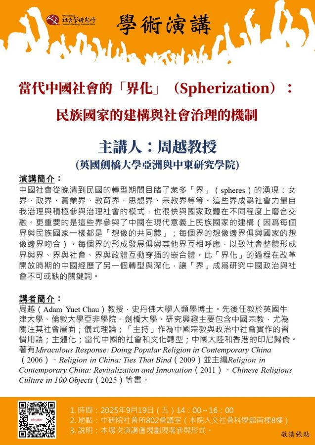 中研院社會所9/19「當代中國社會的『界化』:民族國家的建構與社會治理的機制」演講