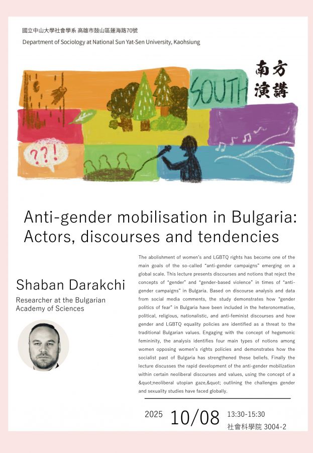 演講簡介: The abolishment of women’s and LGBTQ rights has become one of the main goals of the so-called “anti-gender campaigns” emerging on a global scale. This lecture presents discourses and notions that reject the concepts of “gender” and “gender-based violence” in times of “anti-gender campaigns” in Bulgaria. Based on discourse analysis and data from social media comments, the study demonstrates how “gender politics of fear” in Bulgaria have been included in the heteronormative, political,religious, nationalistic, and anti-feminist discourses and how gender and LGBTQ equality policies are identified as a threat to the traditional Bulgarian values. Engaging with the concept of hegemonic femininity, the analysis identifies four main types of notions among women opposing women’s rights policies and demonstrates how the socialist past of Bulgaria has strengthened these beliefs.Finally the lecture discusses the rapid development of the anti-gender mobilization within certain neoliberal discourses and values, using the concept of a "neoliberal utopian gaze,"outlining the challenges gender and sexuality studies have faced globally.