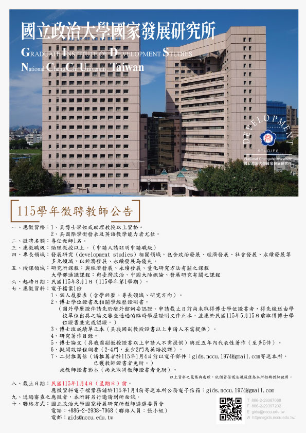 政大國發所 115學年徵聘教師公告(1/4 止)