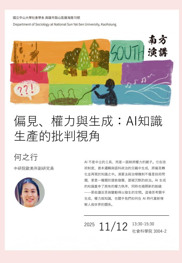 中山社會系南方演講 11/12 「偏見、權力與生成:AI知識生產的批判視角」 演講