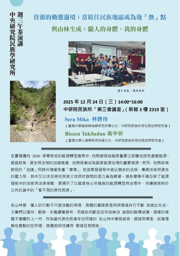 中研院民族所 12/24 資源的動態邊境:當原住民族地區成為地「熱」點/與山林生成:獵人的身體、我的身體 演講