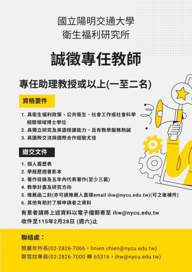陽交大衛福所 誠徵專任教師 ( 2 / 28 止)