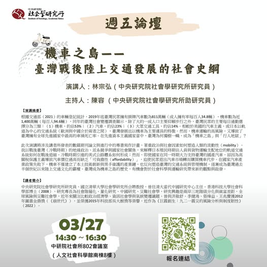 中研院社會所週五論壇:機車之島──臺灣戰後陸上交通發展的社會史綱(3/27)