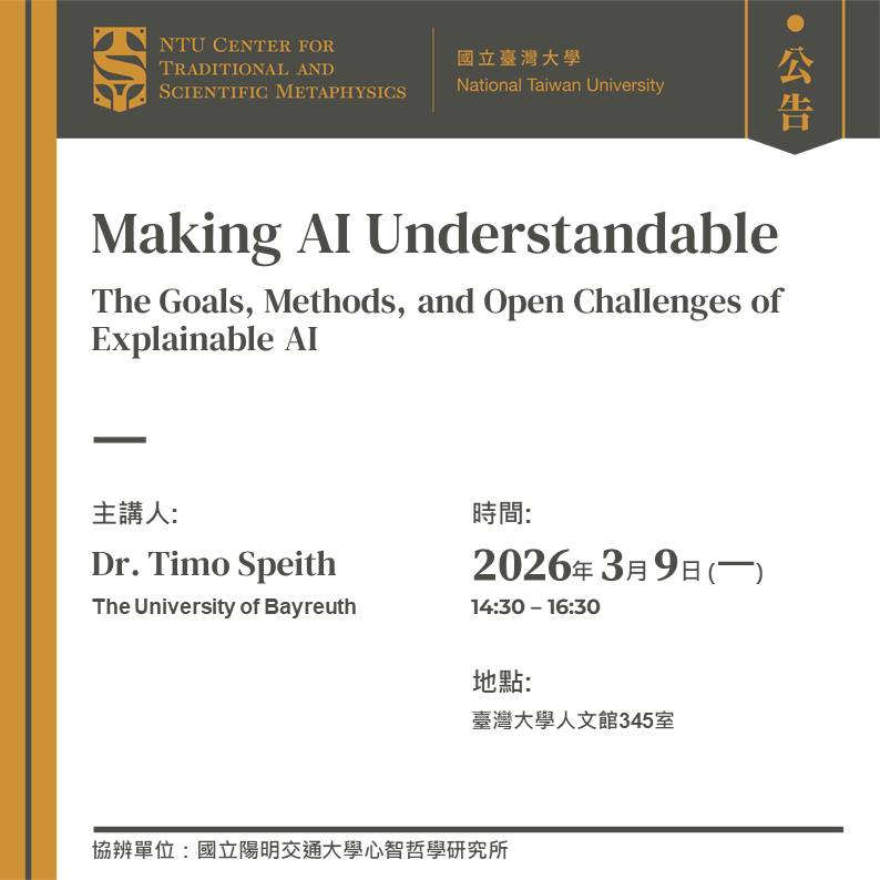 主講人:Dr. Timo Speith (Lecturer, Department of Philosophy, The University of Bayreuth)