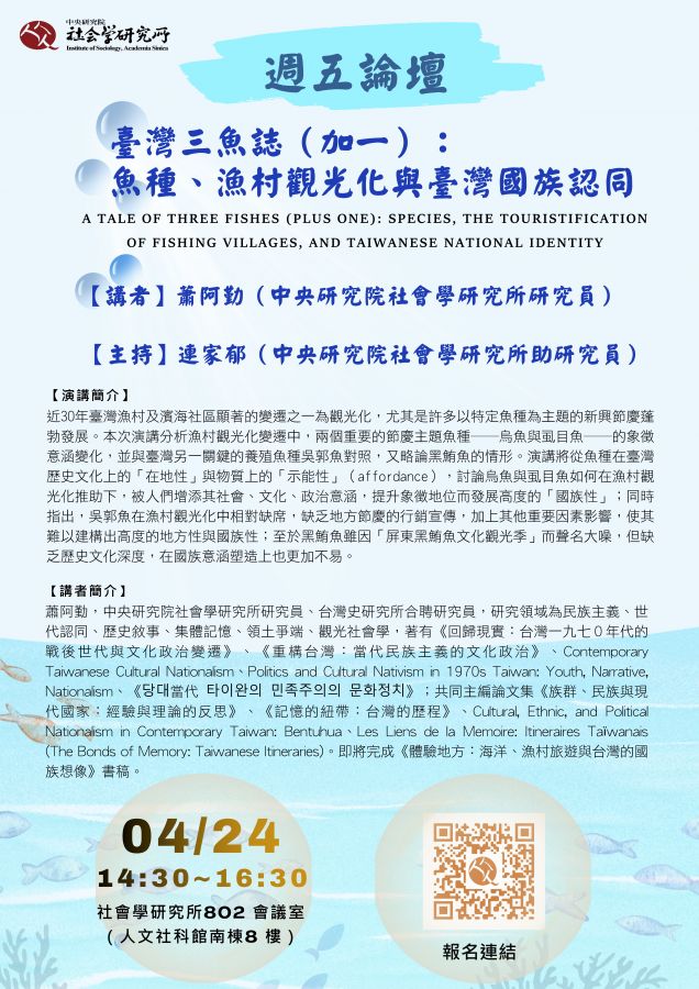 中研院社會所週五論壇「臺灣三魚誌(加一):魚種、漁村觀光化與臺灣國族認同」(4/24)