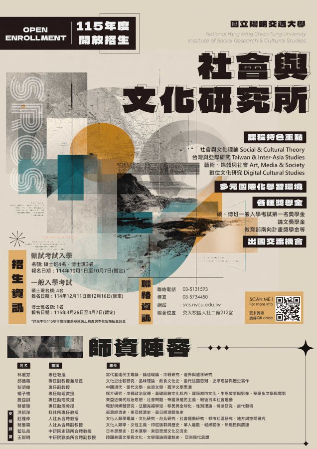 國立陽明交通大學社會與文化研究所115學年度博士班考試入學招生公告(4/7截止)