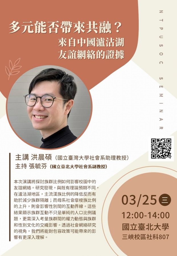 本次演講將探討族群比例如何影響校園中的友誼網絡。研究發現,與既有理論預期不同,在瀘沽湖地區,主流漢族比例的降低反而有助於減少族群隔離;而母系社會摩梭族比例的上升,則會影響性別間的互動界線。這些結果顯示族群互動不只是單純的人口比例議題,更需深入考量族群間的權力動態與族群和性別文化的交織影響。透過社會網絡研究的視角,我們將能對包容政策可能帶來的影響有更深入理解。