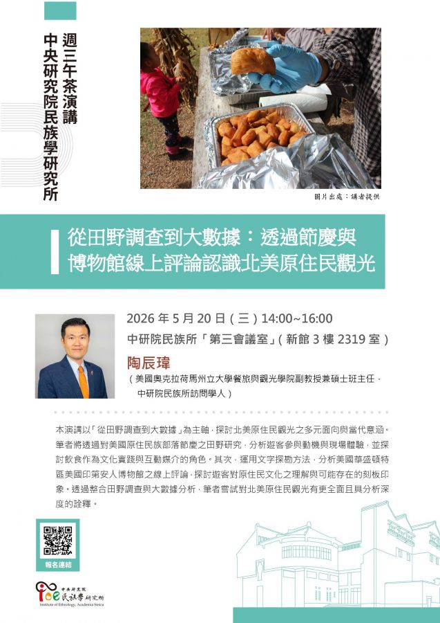 講者:陶辰瑋(美國奧克拉荷馬州立大學餐旅與觀光學院副教授兼碩士班主任,中研院民族所訪問學人)