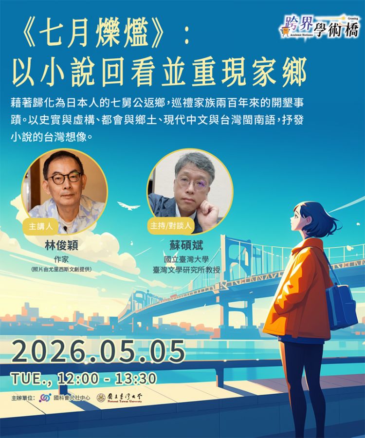 當現代生活日益碎片化,我們能如何回望家族與土地的根脈?本場活動邀請《七月爍爁》作者林俊穎老師,分享其創作。不將小說視為純粹虛構的情節,而把故事立足於真實世界之上,在史實與虛構、都會與鄉土、現代中文與台灣閩南語的激盪中,透過一名日籍長輩返鄉,勾勒中部小鎮的殖民痕跡與當代台北的情感切片,展開一場今昔對照的雙軸敘事。本活動也請來台文館前館長蘇碩斌老師共同對談,兩位老師將深入交流對台灣風土的多元想像,機會難得,誠摯邀請您一同參與!