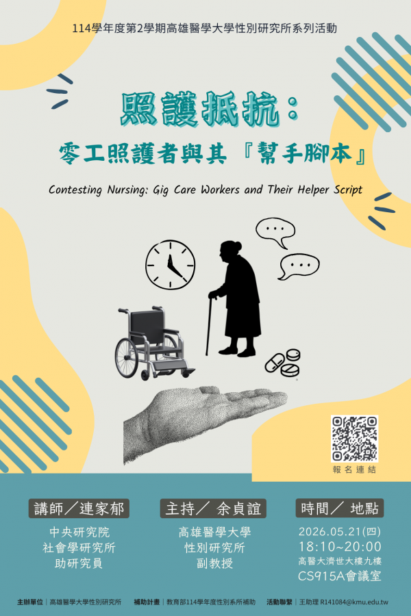 高醫大性別所學術演講---連家郁助研究員:「照護抵抗:零工照護者與其『幫手腳本』」(5/21)