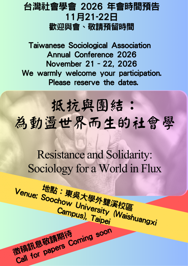 2026 年台灣社會學會年會的主題與日期已經確定囉!誠摯邀請各界學術夥伴與關心社會議題的朋友們,先將這兩天的時間預留下來,與我們一同在東吳大學相聚交流。