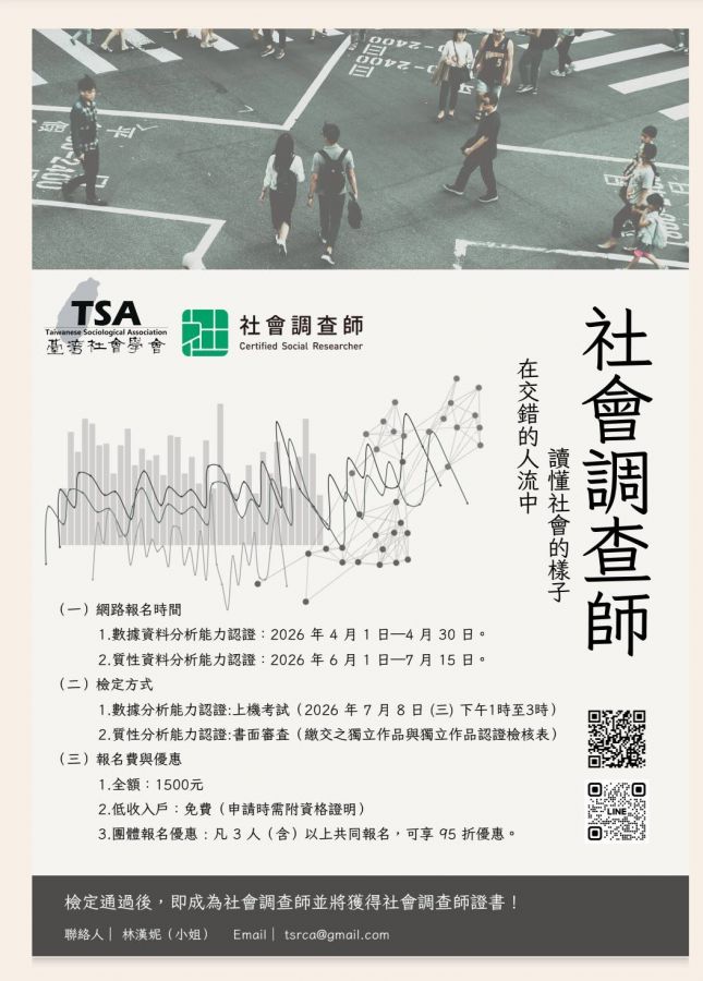 更多資訊請上台灣社會學會社會調查師官網:https://www.tsatw.org.tw/